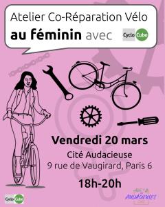 3ème session – Ateliers vélo féminins – Cité Audacieuse Publié parraphcyclomars 10, 2026mars 10, 2026Publié dansActualité, AnimationsÉtiquettes :animation, atelier vélo, cyclocube, feminin, mécanique, vélo vendredi 20 mars, de 18h à 20h (inscris-toi) Entrée par le café Les Audacieuses, rendez-vous dans la cour. Partager : Partager sur WhatsApp(ouvre dans une nouvelle fenêtre) WhatsApp Partager sur Mastodon(ouvre dans une nouvelle fenêtre) Mastodon Partager sur Bluesky(ouvre dans une nouvelle fenêtre) Bluesky J’aime chargement… Similaire